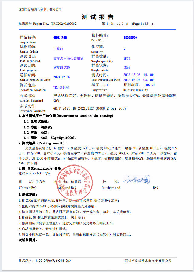比亞迪合作商泰瑞琦公司檢測(cè)報(bào)告(材料ADC12)鹽霧1000小時(shí)檢測(cè)報(bào)告